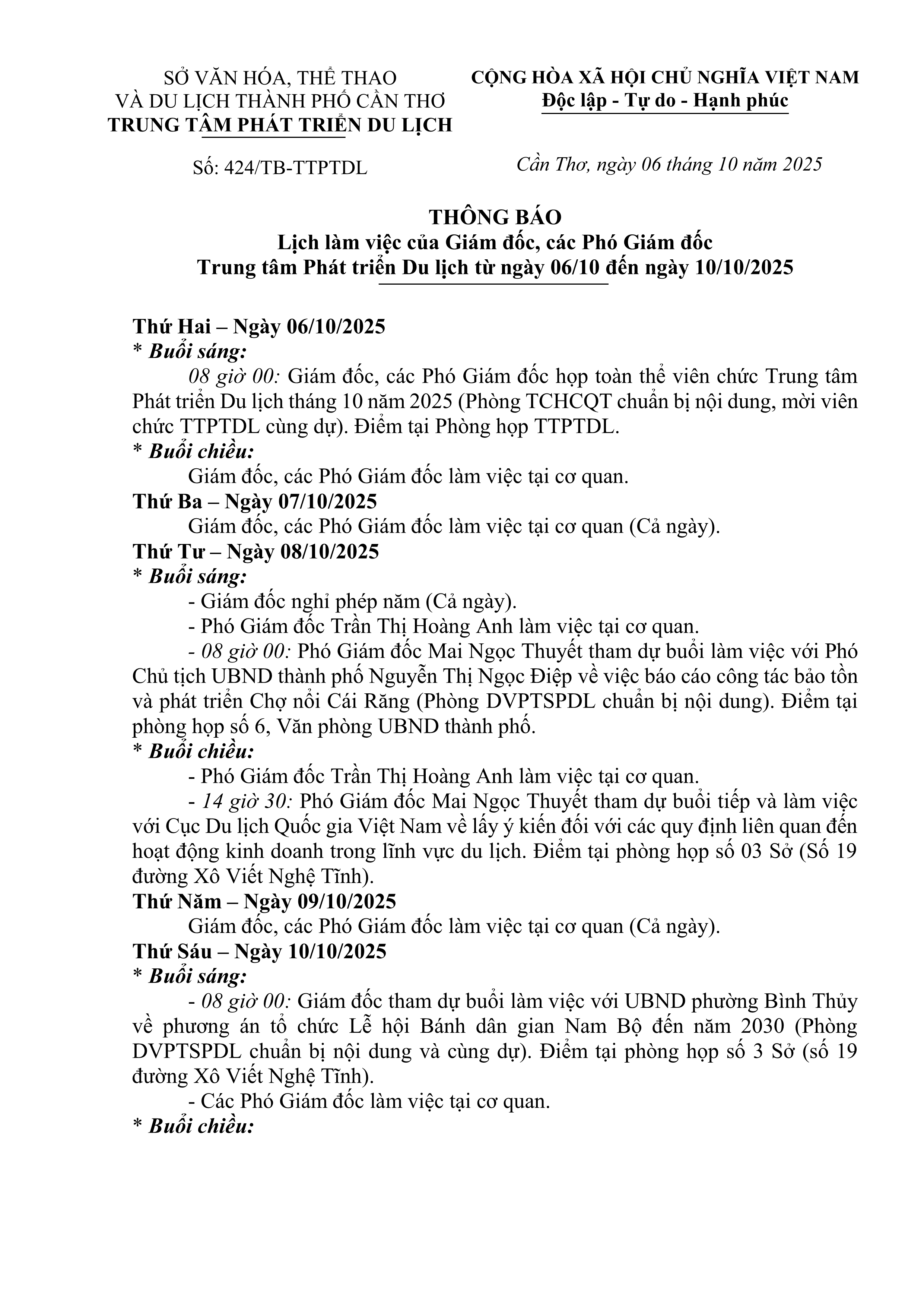 THÔNG BÁO Lịch làm việc của Giám đốc, các Phó Giám đốc Trung tâm Phát triển Du lịch từ ngày 06/10 đến ngày 10/10/2025