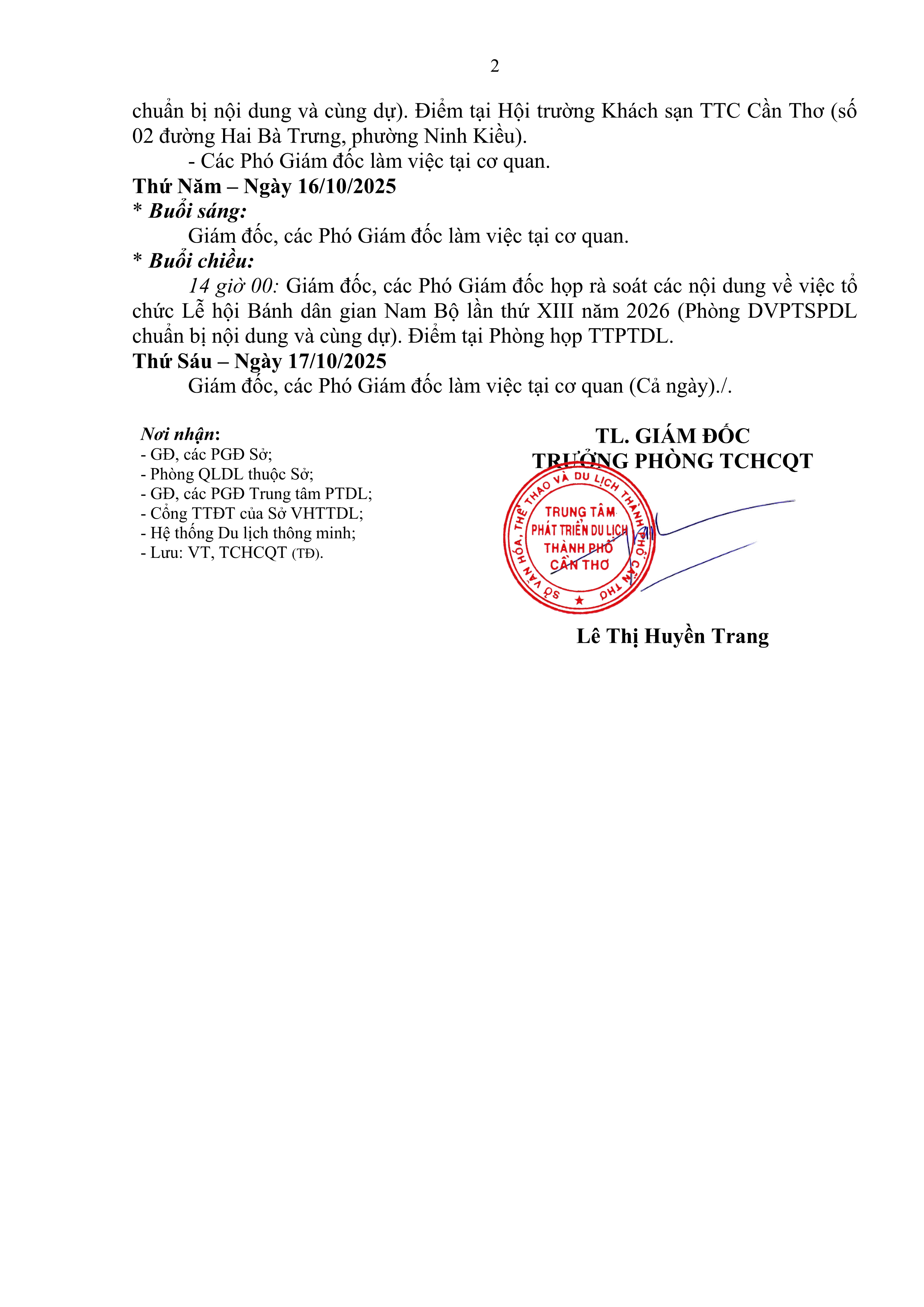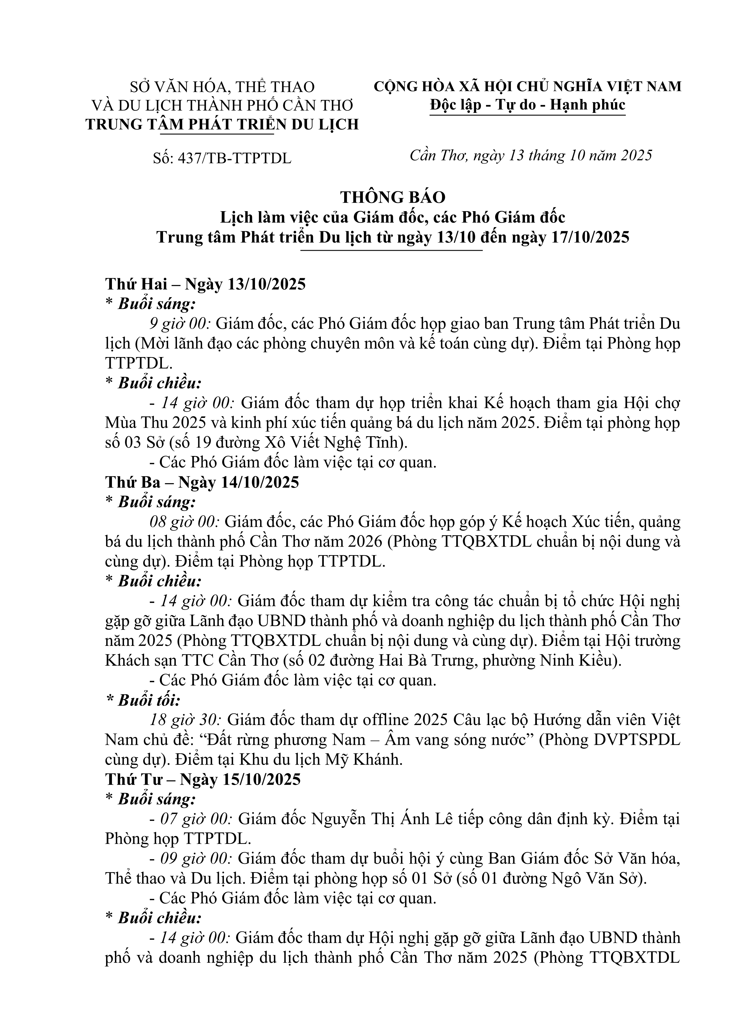 THÔNG BÁO Lịch làm việc của Giám đốc, các Phó Giám đốc Trung tâm Phát triển Du lịch từ ngày 13/10 đến ngày 17/10/2025
